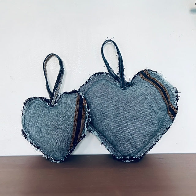 Verschenken Sie eine einzigartige, nachhaltige und umweltfreundliche Dekoration mit diesen handgefertigten Herzen aus recyceltem Jeansstoff.