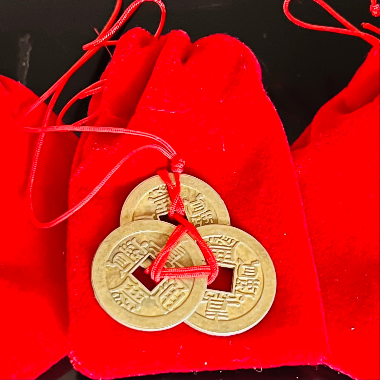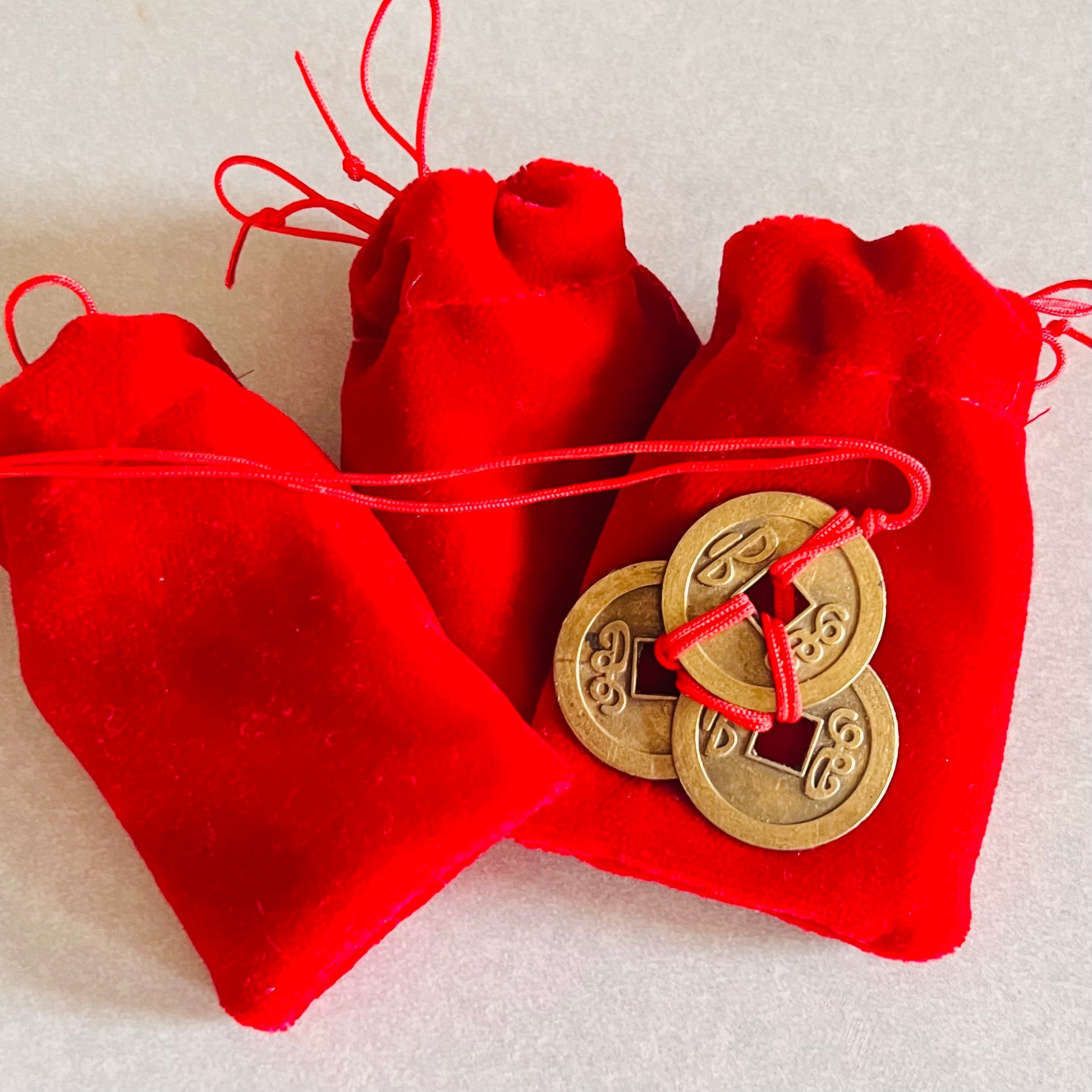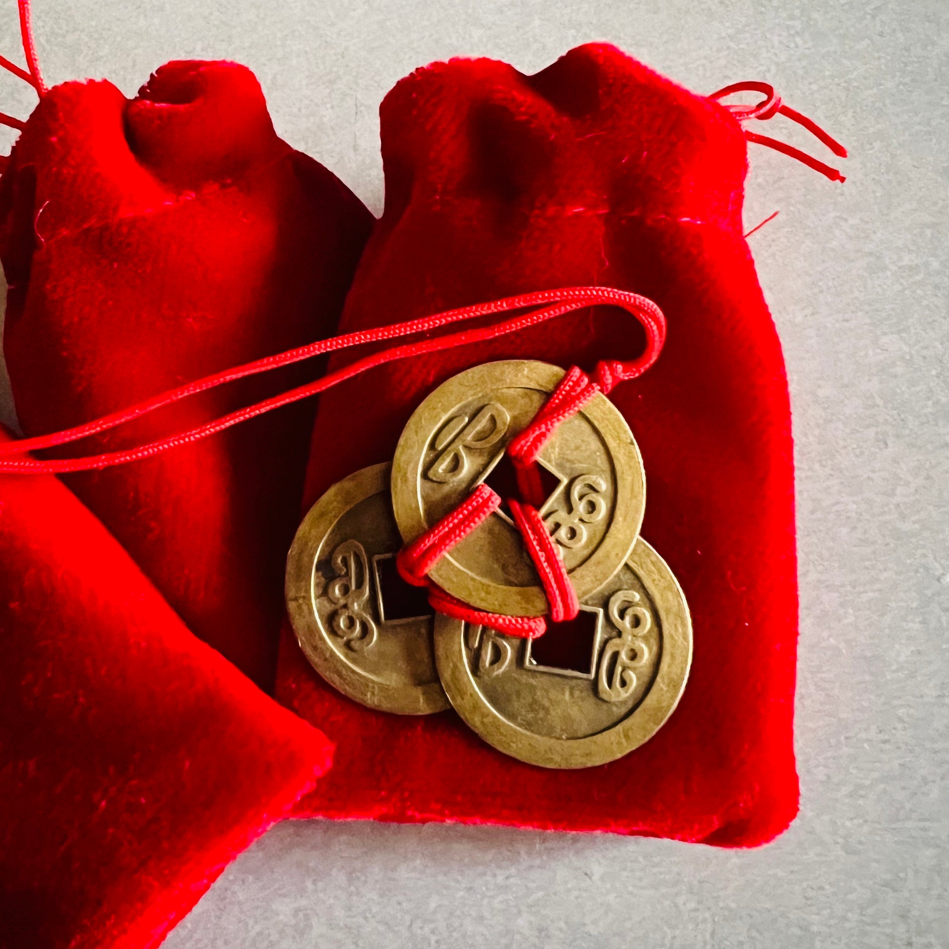 Feng-Shui-Münzen werden als Symbol für Wohlstand und Glück verwendet. Die Verbindung von drei Glücksmünzen (durch einen roten Faden verbunden) stellt die Verbindung von Himmel, Erde und Mensch dar. Stecken Sie sie in Ihre Brieftasche.
